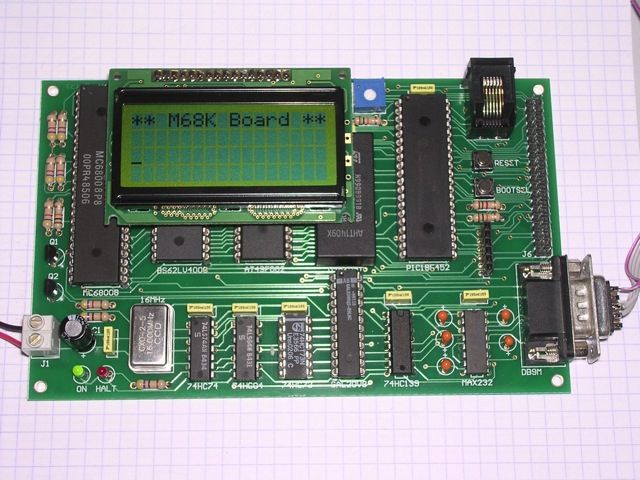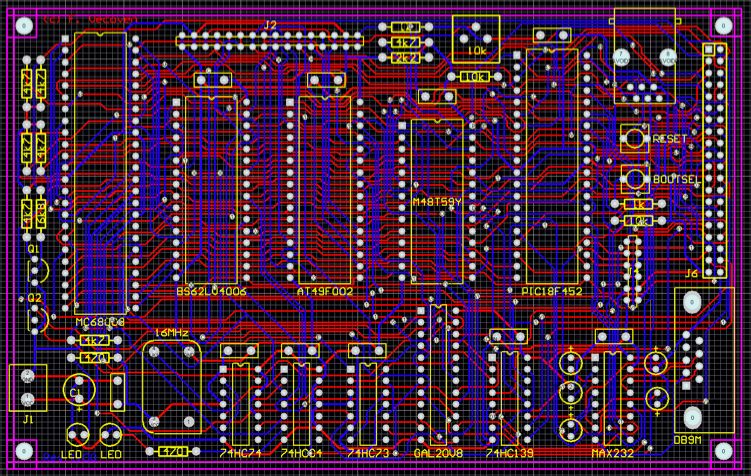 Updated June 25th 09 : The board is now completed on a PCB. The PCB was made by Olimex. To keep a size of 160x100mm, the debug LEDs have been removed, but a connector for extension has been added. Assembling the board went smoothly, except for the 74LS73 (or HCT version), where Protel 99 had a bug in its library and swapped Vcc and ground. This resulted in a dead part (I had current limiting, but that didn’t suffice !) and a desoldering session to replace the bad part with a socket.